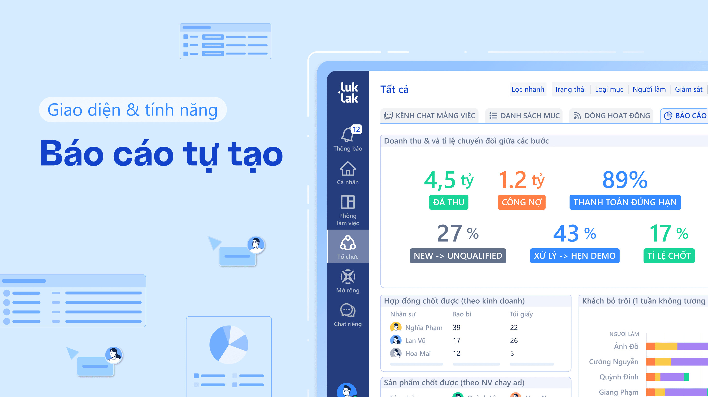 Người dùng có thể tạo báo cáo để trực quan hóa tình hình công việc, dữ liệu ở từng Mảng việc, Khu vực, hay toàn tổ chức.